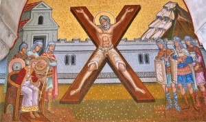 Considerându-se nevrednic să fie răstignit pe o cruce asemenea celei a Învăţătorului său, Sfântul Andrei a cerut şi a fost răstignit pe una în forma de „X” (numită până astăzi „Crucea Sfântului Andrei”), dând astfel o deosebită dovadă de smerenie.