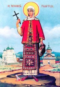 “Întru răbdarea ta ți-ai agonisit plata ta, Fericită Filofteia, întru ispite neîncetat răbdând, întru bătăi suferind, întru necazuri binevoind pe săraci miluindu-i și pe flămânzi săturându-i; roagă-te lui Hristos Dumnezeu, bună fecioară, să se mântuiască sufletele noastre.“ (Tropar)